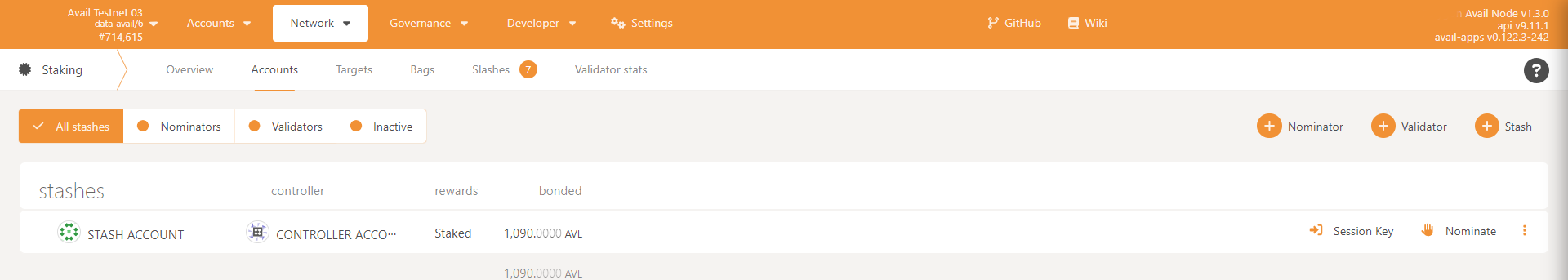 FUNDING ACCOUNTSKeep the majority of your funds in the stash account and only a minimal amount in the controller account to cover transaction fees.For validators participating in our testnet, contact the Avail team to have funds transferred.