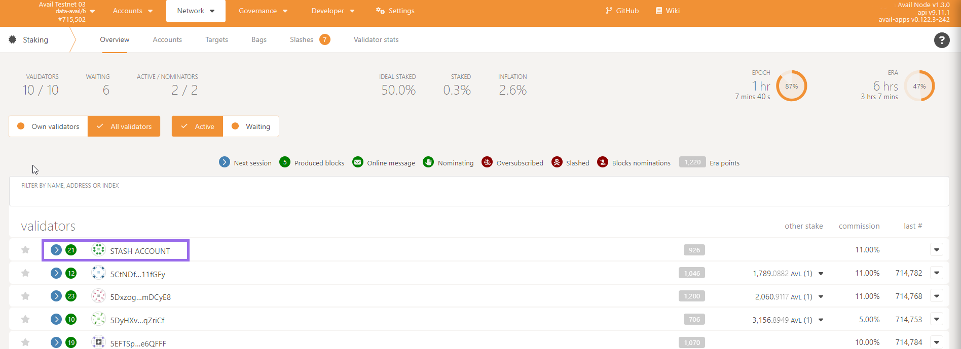 Your validator is now prepared to begin the validation process. If you wish to discontinue, you can click the stop icon. Please note that the Avail interface doesn't automatically verify if your node is synchronized; you'll need to confirm this manually. If your node has sufficient stake, the Avail blockchain will likely select it in the next epoch or two.ββ